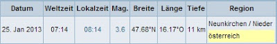 Am Freitag, den 25. Jänner 2013 ereignete sich um 08:14 Uhr bei Seebenstein im Raum Neunkirchen in Niederösterreich ein Erdbeben, das eine Magnitude von 3,6 aufwies.