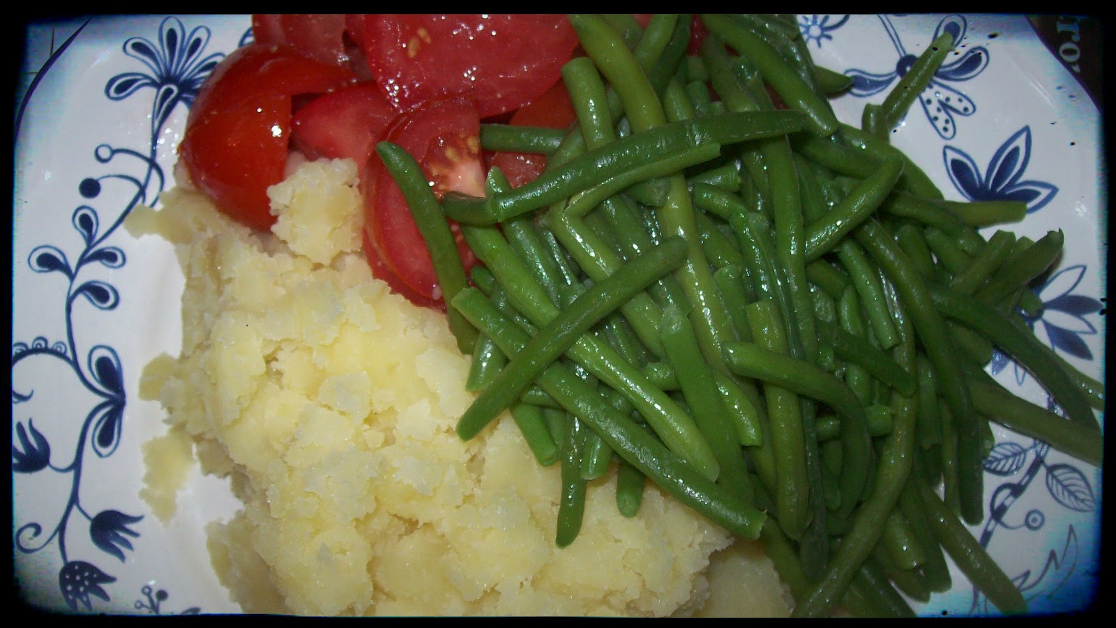 | Kartoffelstampf mit grünen Bohnen und Tomatensalat |